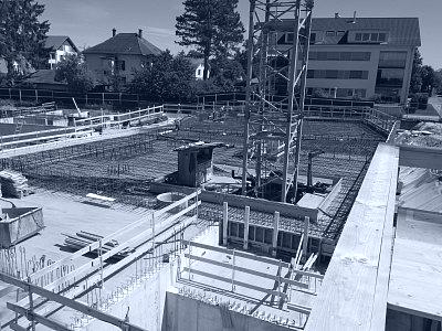 Die Gebäude wurden in klassischer Massivbauweise erstellt. Die teilweise grossen Spannweiten im EG und Foyer in Kooperation mit der darunterliegenden Tiefgarage definieren die Lage der Stützen. Um den Lastfluss zu optimieren wurden Wände teilweise nichttragend ausgebildet.