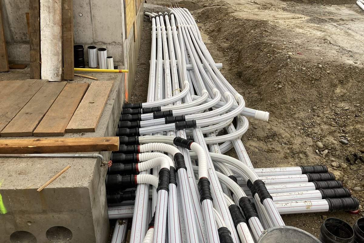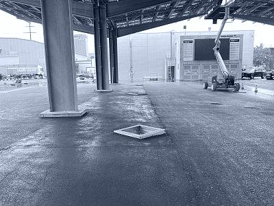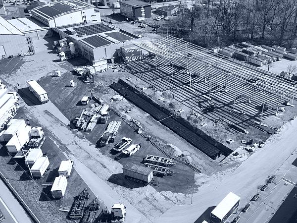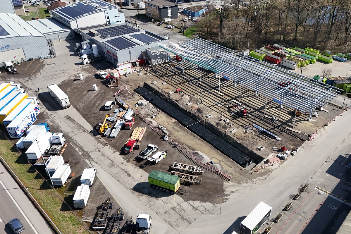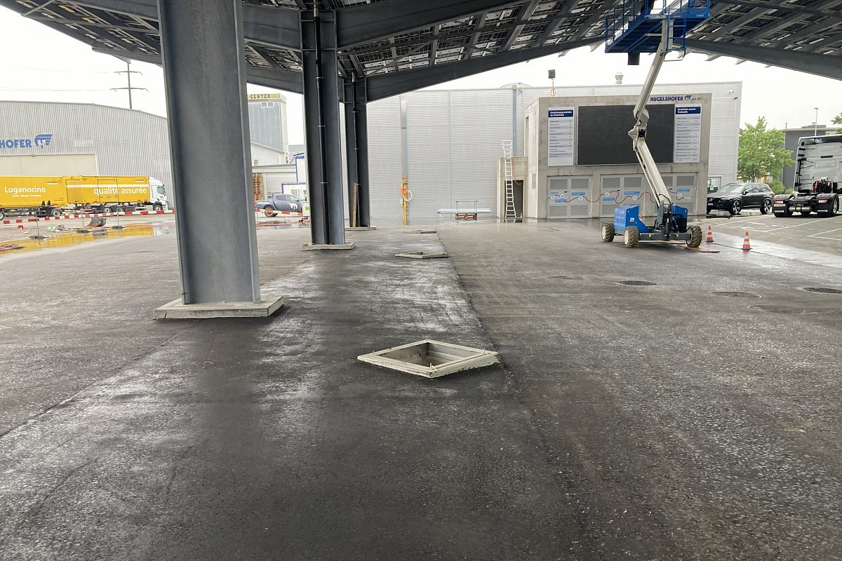 Die Hugelshofer Services AG realisierte 14 Schnellladesäulen für Elektro-Lastwagen sowie zwei Y-Dachkonstruktionen mit integrierter Photovoltaikanlage (je ca. 75 m × 22 m) und eine neue Trafostation . Wir waren verantwortlich für Baugesuch, die Planung der Dach- und Platzentwässerung, die Platzgestaltung sowie die Erschliessung der Trafostation und der Schnellladesäulen. Zudem erarbeiteten wir die statischen Nachweise und die Schalungs- und Bewehrungspläne für die Trafostation und die 14 Köcherfundamente der Dachkonstruktion. Das gesamte Dach- und Platzwasser musste innerhalb der Parzelle versickert werden. Für die rund 9'000 m² grosse Fläche wurden drei unterirdische Versickerungsanlagen mit einer Gesamtfläche von 470 m² und einem Retentionsvolumen von insgesamt ca. 300 m³ erstellt.