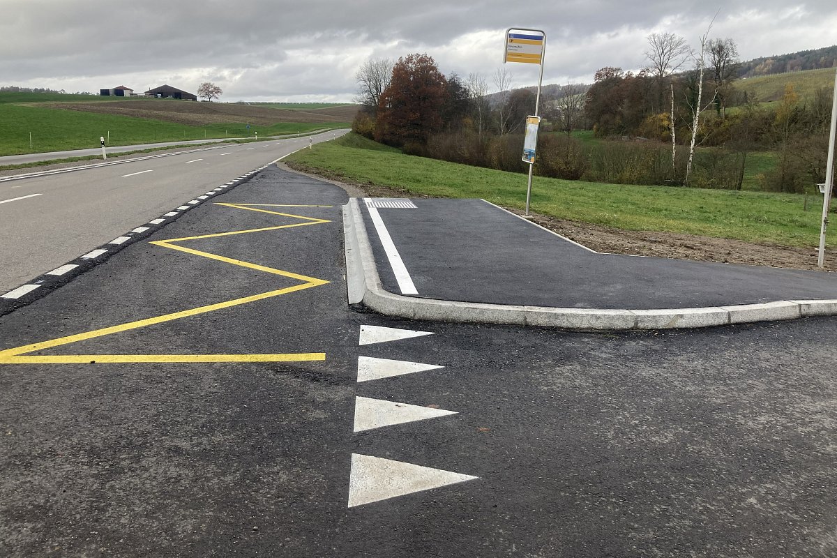 Auf der Strasse H465 zwischen Weiningen und Hüttwilen wurde auf einer Länge von rund 1.6 km die Deckschicht erneuert. Dazu wurde der bestehende Deckbelag vollständig abgefräst und anschliessend eine neue 3 cm starke Deckschicht aus AC 8 S eingebaut.Im Vorfeld der Belagsarbeiten wurden die beiden Haltestellen Neumühle behindertengerecht ausgebaut und eine neue Busbucht erstellt. Für deren Realisierung war zudem der Bau einer Stützmauer aus Ortbeton erforderlich. Die Arbeiten an der Bushaltestelle erfolgten etappiert und unter laufendem Verkehr, sodass der Verkehr jederzeit aufrechterhalten werden konnte.