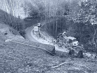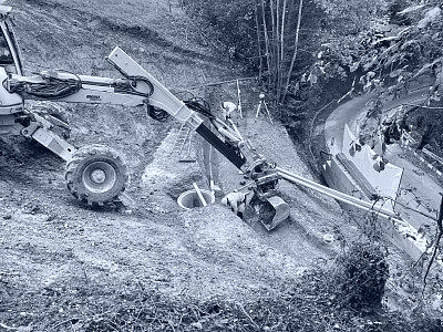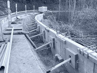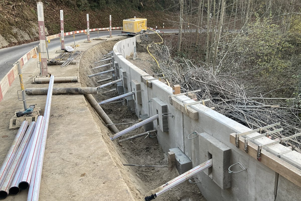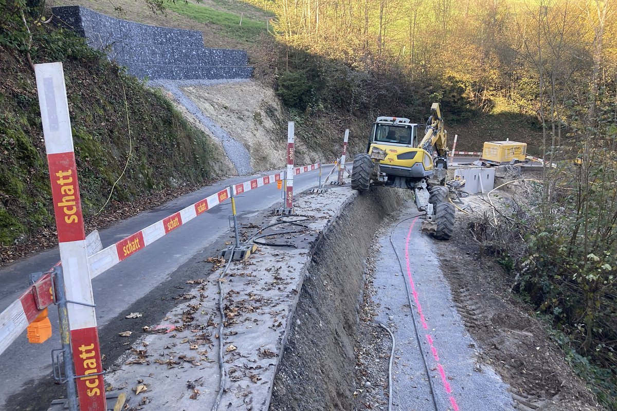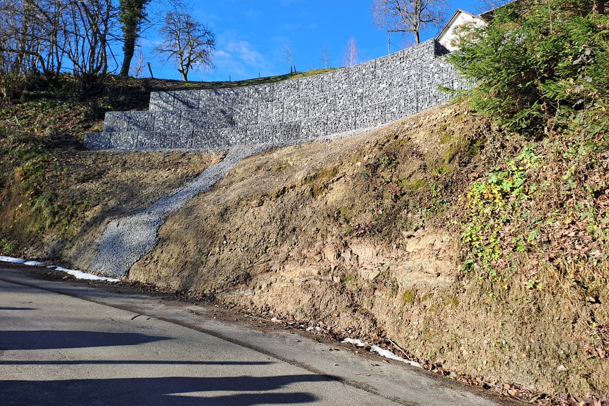 Im Mai 2024 führte ein Starkregenereignis im Waldstück Au–Rotbühl zu einem Hangrutsch, der sowohl berg- als auch talseitig Sicherungsmassnahmen erforderlich machte. Bergseitig wurde der Nagelfluh freigelegt, neue Drainageleitungen verlegt und eine Steinkorbmauer erstellt. Der Bereich hinter der Mauer wurde anschliessend wieder verfüllt. Zudem wurde die freiliegende Nagelfluhfläche mit einem Drahtmaschennetz inklusive Ankern gesichert und begrünt. Talseitig erfolgte die Hangsicherung auf einer Länge von 34 m mit vorgefertigten GMK-Elementen, die ebenfalls mit Ankern und Mikropfählen stabilisiert wurden. An diesen Elementen wurde zusätzlich eine Leitschranke montiert. Die Arbeiten erfolgten unter Verkehr.