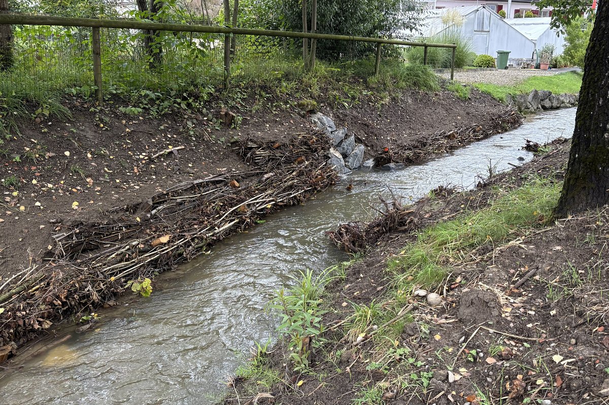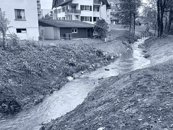 Beim vorliegenden Projekt handelt es sich um ein reines Revitalisierungsprojekt, da im Abschnitt km 0.900 – 1.010 keine Hochwassergefährdung bestand. In diesem Bereich wurde die Gewässersohle verbreitert und die rechtsufrige Böschung abgeflacht. Dadurch wird das Gewässer für die Bevölkerung besser zugänglich und erlebbarer. Mit dem Rückbau der bestehenden Uferverbauungen konnte die Breitenvariabilität des Baches erhöht werden. Zudem wurden neue ökologische Strukturen wie Steinhaufen, Totholzelemente und Asthaufen eingebracht, um den Lebensraum für Flora und Fauna nachhaltig zu verbessern.