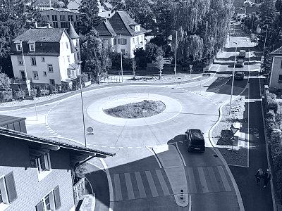 Der schadhafte, provisorische Minikreisel beim Knoten Winterthurerstrasse/Q20 erfüllte die verkehrstechnischen Anforderungen nicht. Unter Einbezug der bisher unbebauten Nachbarparzelle wurde als Massnahme ein Kleinkreisel mit einem Durchmesser von 26 m realisiert. Die Ausführung des Kreisels erfolgte in Betonbauweise um eine hohe Lebensdauer zu erreichen. Die Fahrbahnoberfläche wurde zur Lärmreduktion in Waschbeton ausgeführt. Für die Fussgänger wurden Gehwege in Asphalt rund um den Kreisel geführt und mit zwei Fussgängerquerungen verbunden. Aus Gründen der Störfallvorsorge wird sämtliches Strassenabwasser über ein Störfallbecken mit automatisiertem Störfallschieber geführt.
