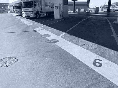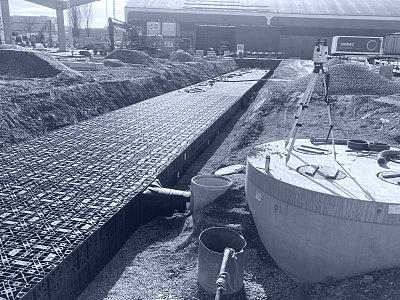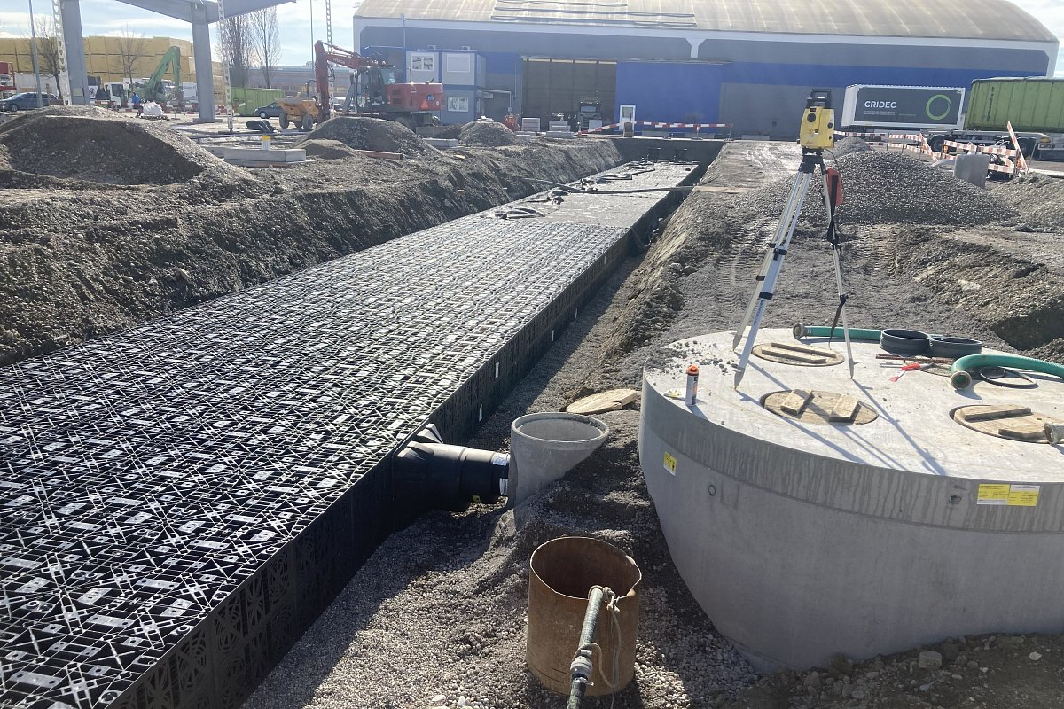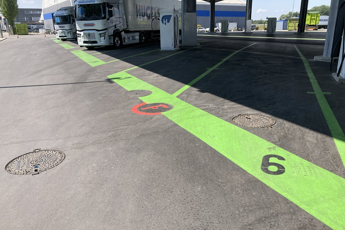 Die Hugelshofer Services AG realisierte 14 Schnellladesäulen für Elektro-Lastwagen sowie zwei Y-Dachkonstruktionen mit integrierter Photovoltaikanlage (je ca. 75 m × 22 m) und eine neue Trafostation . Wir waren verantwortlich für Baugesuch, die Planung der Dach- und Platzentwässerung, die Platzgestaltung sowie die Erschliessung der Trafostation und der Schnellladesäulen. Zudem erarbeiteten wir die statischen Nachweise und die Schalungs- und Bewehrungspläne für die Trafostation und die 14 Köcherfundamente der Dachkonstruktion. Das gesamte Dach- und Platzwasser musste innerhalb der Parzelle versickert werden. Für die rund 9'000 m² grosse Fläche wurden drei unterirdische Versickerungsanlagen mit einer Gesamtfläche von 470 m² und einem Retentionsvolumen von insgesamt ca. 300 m³ erstellt.