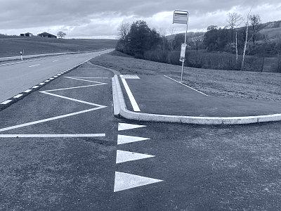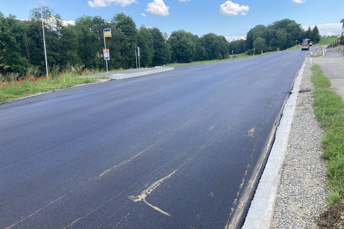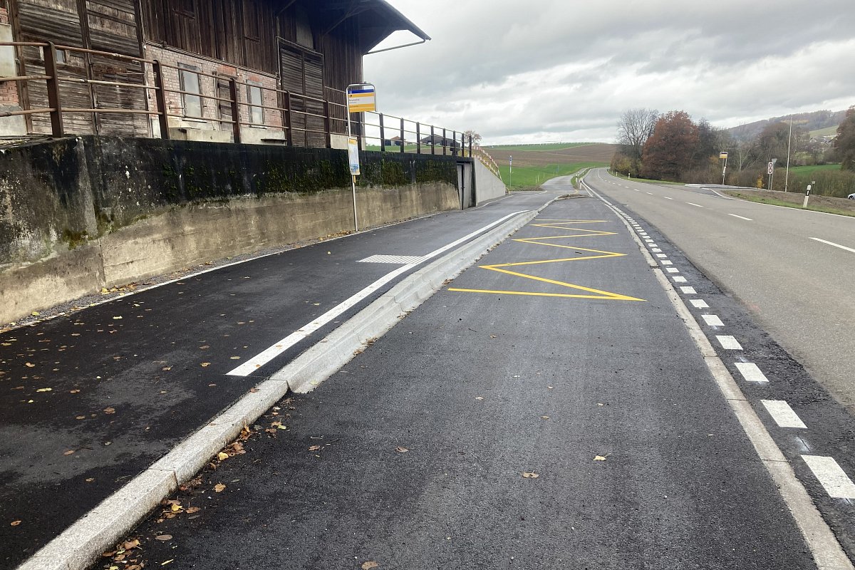 Auf der Strasse H465 zwischen Weiningen und Hüttwilen wurde auf einer Länge von rund 1.6 km die Deckschicht erneuert. Dazu wurde der bestehende Deckbelag vollständig abgefräst und anschliessend eine neue 3 cm starke Deckschicht aus AC 8 S eingebaut.Im Vorfeld der Belagsarbeiten wurden die beiden Haltestellen Neumühle behindertengerecht ausgebaut und eine neue Busbucht erstellt. Für deren Realisierung war zudem der Bau einer Stützmauer aus Ortbeton erforderlich. Die Arbeiten an der Bushaltestelle erfolgten etappiert und unter laufendem Verkehr, sodass der Verkehr jederzeit aufrechterhalten werden konnte.