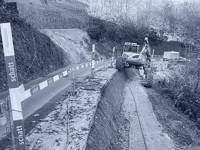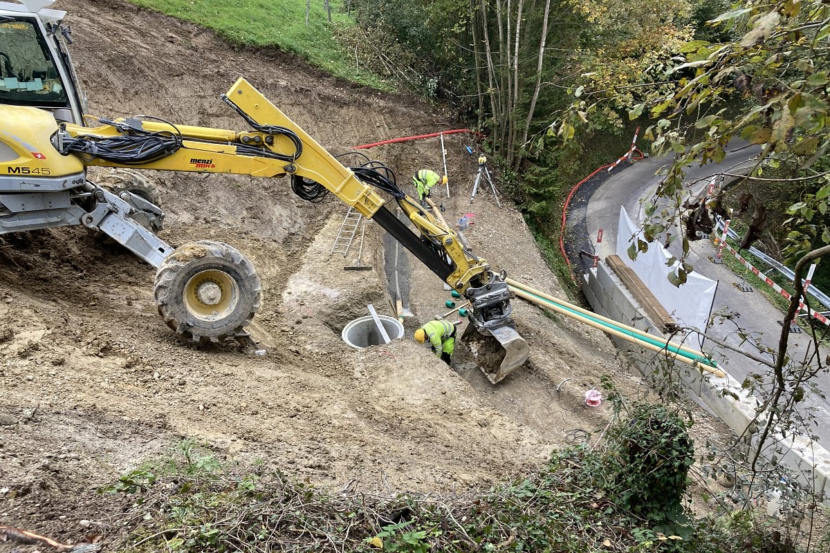 Im Mai 2024 führte ein Starkregenereignis im Waldstück Au–Rotbühl zu einem Hangrutsch, der sowohl berg- als auch talseitig Sicherungsmassnahmen erforderlich machte. Bergseitig wurde der Nagelfluh freigelegt, neue Drainageleitungen verlegt und eine Steinkorbmauer erstellt. Der Bereich hinter der Mauer wurde anschliessend wieder verfüllt. Zudem wurde die freiliegende Nagelfluhfläche mit einem Drahtmaschennetz inklusive Ankern gesichert und begrünt. Talseitig erfolgte die Hangsicherung auf einer Länge von 34 m mit vorgefertigten GMK-Elementen, die ebenfalls mit Ankern und Mikropfählen stabilisiert wurden. An diesen Elementen wurde zusätzlich eine Leitschranke montiert. Die Arbeiten erfolgten unter Verkehr.