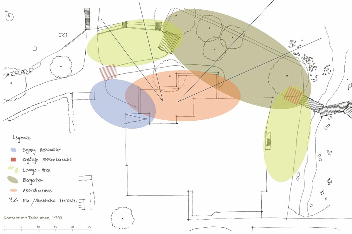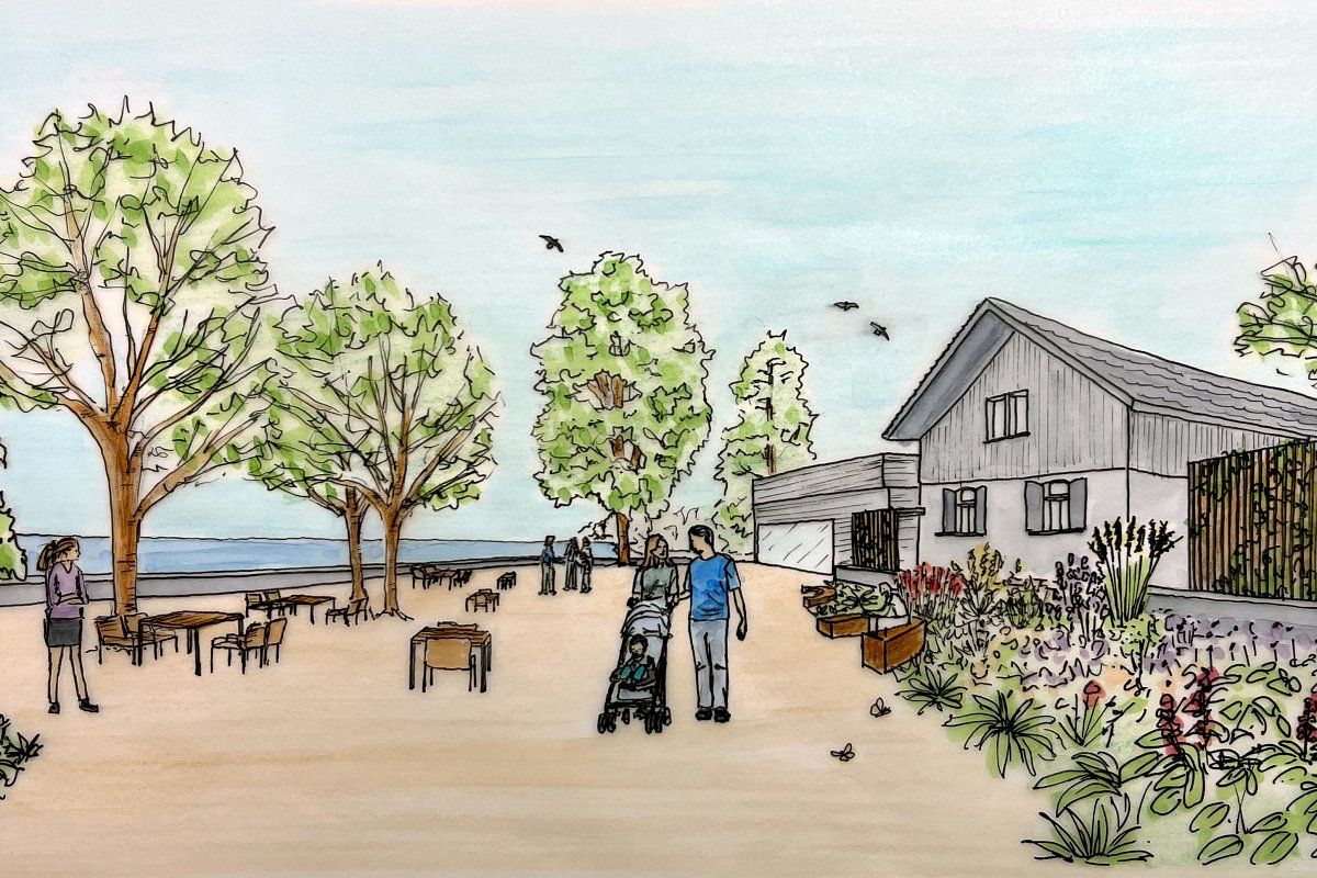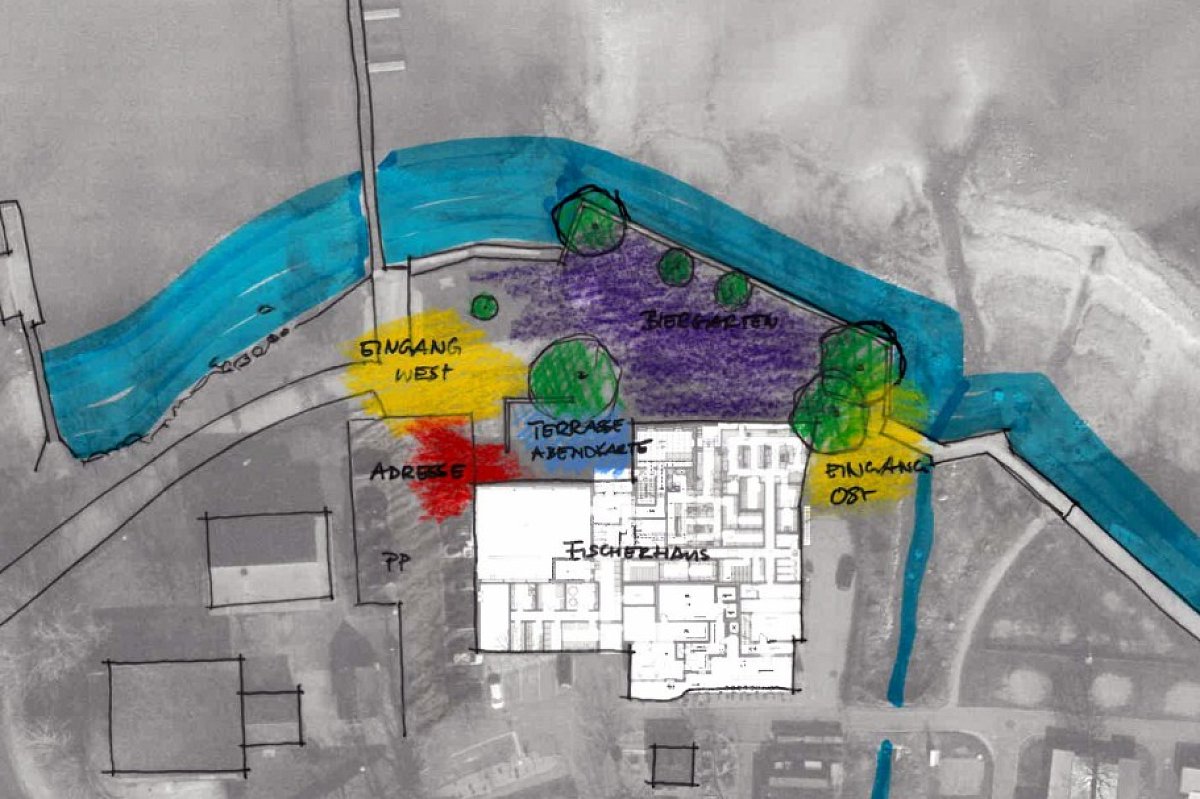 Es wurde auf Grundlage des architektonischen Vorprojekts der LPB Architekten AG ein Grobkonzept für die Aussenraumgestaltung des Restaurants Fischerhaus inklusive Visualisierungen zur Budgetabstimmung erarbeitet. Dabei wurden die räumliche Entwicklung und die funktionale Gliederung des Aussenraums untersucht und weiterentwickelt. Zentrale Themen waren die Wegeführung und Zugänglichkeiten, die Ausbildung eines klaren Ankunftsorts sowie die Adressbildung des Restaurants. Zudem wurden die Platz- und Eingangsbereiche auf der Ost- und Westseite konzipiert, ein stimmiges Möblierungskonzept für den Aussenraum entwickelt und neue Aufenthaltsangebote wie Sitznischen im Garten, eine Pavillonlösung, die Aufwertung des Biergartens sowie zusätzliche Sitzmöglichkeiten entlang des Chogebachs integriert, um die Aufenthaltsqualität und Nutzbarkeit des Aussenraums nachhaltig zu verbessern.
