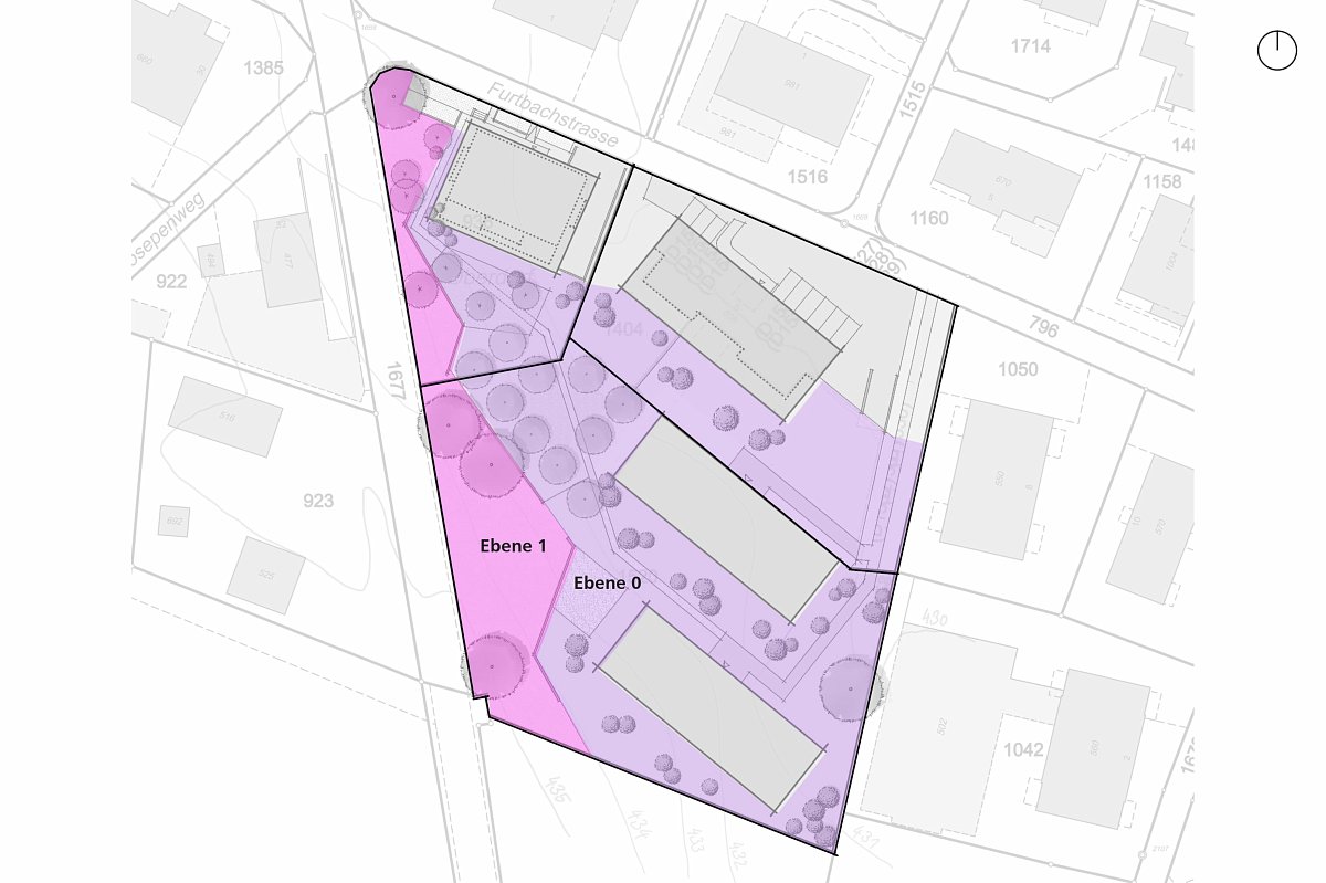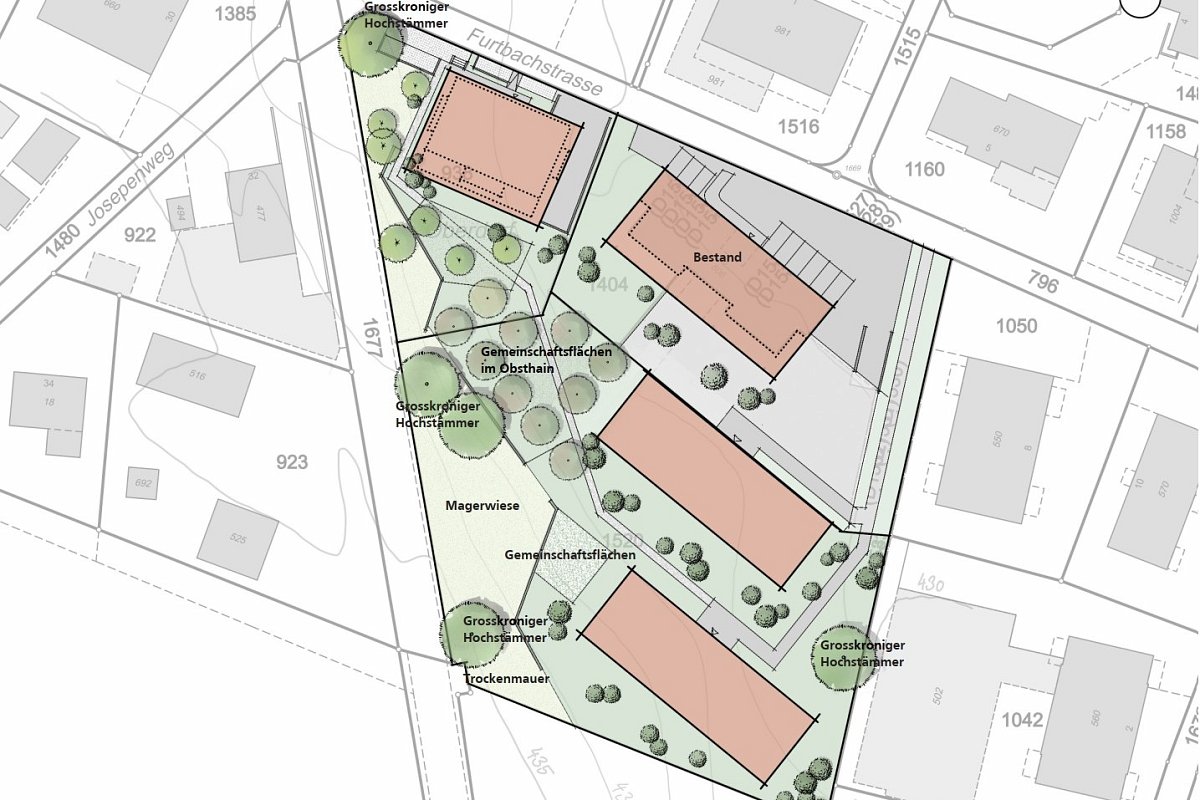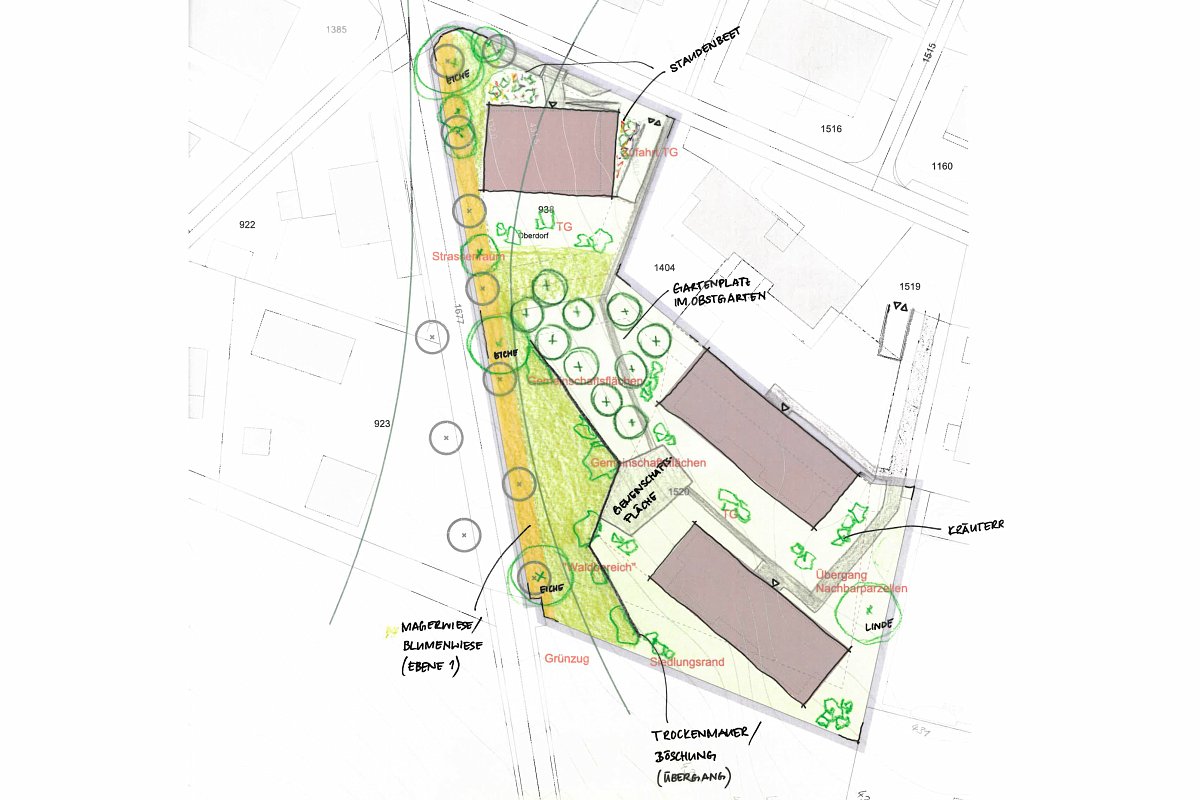 Ausgangspunkt bildete eine vertiefte Analyse der landschaftlichen und kulturhistorischen Gegebenheiten. Die Umgebung ist geprägt durch die Hanglage mit gut ablesbaren Ackerterrassen sowie durch typische Streuobststrukturen. Diese prägenden Elemente wurden bewusst aufgenommen und in die Freiraumplanung integriert. Das Element des bestehenden Obstgartens wird im Freiraumkonzept übernommen und als identitätsstiftender sowie ökologisch wertvoller Bestandteil weiterentwickelt.