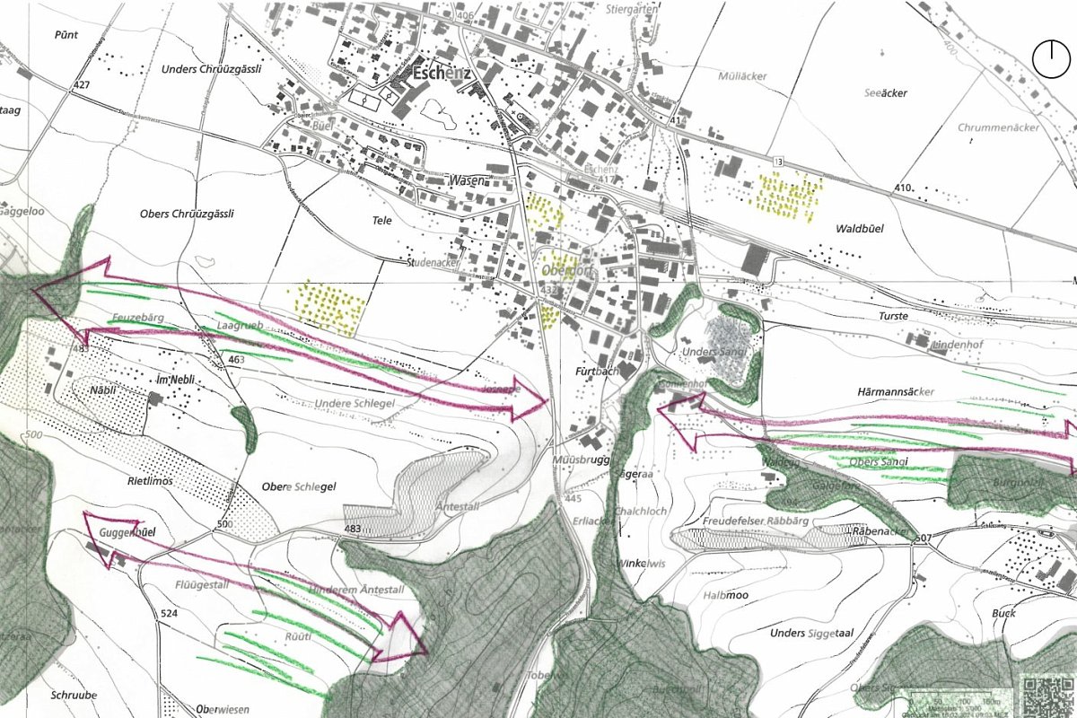 Für das Planungsgebiet im Süden der Gemeinde Eschenz (Parzellen Nrn. 938, 1520, 1404 und 1519) wurde ein Richtprojekt Freiraum erarbeitet. Dieses bildet eine zentrale Grundlage des Gestaltungsplans, der durch die bhateam ingenieure ag erarbeitet wurde. Das Richtprojekt Freiraum zeigt auf, wie der Aussenraum im Übergang zwischen Siedlung und offener Kulturlandschaft entwickelt werden kann.
