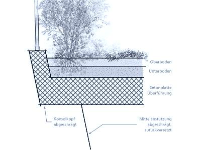 Das Kantonale Tiefbauamt Thurgau hat uns eingeladen, ein Angebot für die Ingenieurleistungen der Teilphase 32 (Bauprojekt) einzureichen. In diesem Zusammenhang entstand in interdisziplinärer Zusammenarbeit mit der ARX Gruppe AG ein Entwurf für eine Wildtierüberführung über die A1 bei Wängi. Ausgangspunkt bildete eine Analyse der topografischen und landschaftlichen Situation. Südlich der Nationalstrasse ermöglicht das ansteigende Waldgebiet «Fuchsbüül» eine nahezu nahtlose Anbindung an das bestehende Terrain. Nördlich der A1 liegt das Gelände infolge der ehemaligen Riedlandschaft deutlich tiefer, weshalb eine differenzierte landschaftliche Modellierung vorgesehen wurde. Der Entwurf sah eine zurückhaltende Stahlbetonkonstruktion mit schlanker Tragwerksausbildung vor. Abgeschrägte Bauteile und eine reduzierte Formensprache verleihen dem Bauwerk eine ruhige Erscheinung. Einheimische Niederhecken und standortgerechte Laubgehölze sollten die Waldgebiete «Fuchsbüül» und «Aadholz» verbinden und die ökologische Durchgängigkeit stärken.