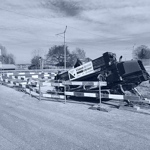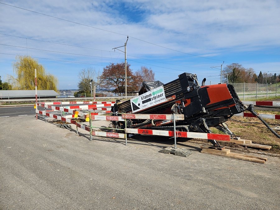 Hierfür kamen zwei gesteuerte Spülbohrungen zum Einsatz. Zunächst wurde ein Bohrkanal unter der Kantonsstrasse sowie der Bahnlinie erstellt.